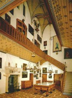 De zeventien meter hoge hal van het kasteel maakt een overweldigende indruk. De beschilderde gewelfbogen zijn geinspireerd op de gewelven van de gotische zaal in het 14de eeuwse stadhuis van het nabije Brugge. Aan het houtsnijwerk van balustrade en paneeltjes van de monumentale trap die met een kwartslag naar de tweede verdieping leidt, heeft Léonard Blanchaert ruim tien jaar gewerkt. De weg omhoog voert langs een dubbelportret van de gebroeders De Wael door A. van Dyck en een St. Jeronimus in een vuurrode mantel met een leeuw uit de school van P.P. Rubens. Boven de machtige schouw in de hal zijn de familiewapens van Caloen en Courcy aangebracht voorzien van hun wapenspreuken 'Virtus Impavida' en 'Malo Mori quam Foedari'.