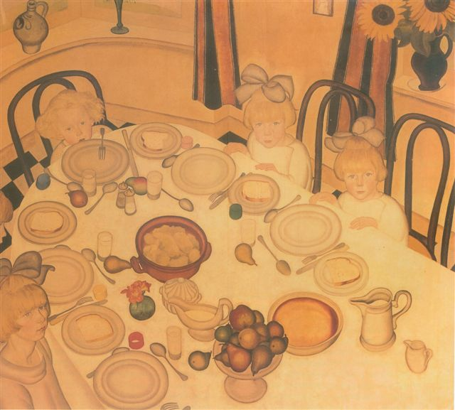 Het jongetje aan het hoofdeinde die met zijn blauwe ogen dromerig over de rand van zijn bordje kijkt is Maxime van de Woestyne. Tientallen jaren later zou hij ons surrealistische naakt schilderen. We danken hem in stilte voor zijn unieke schilderij en omdat hij ons via vreemde labyrinthen de weg wees naar een onvergetelijk mooi museum in Ukkel.