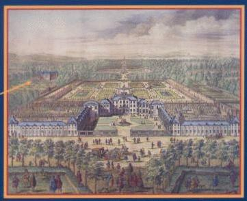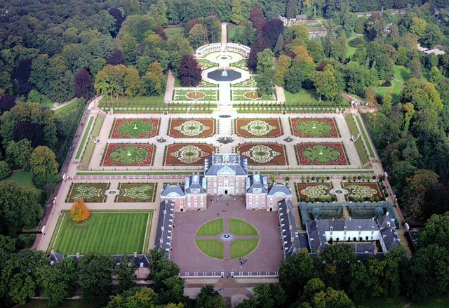 Het Loo is een paleis om vaker te bezoeken. Je ervaart er de luxe van ruimte en rust, die dit Veluwse jachtslot bij de Oranjevorsten zo geliefd maakte. De centrale as loopt precies van noord naar zuid. In het zuiden ligt de basse - court met de Dolfijnensprong; vier marmeren dolfijnen met ineengestrengelde staarten spuwen water naar alle windstreken. In het noorden liggen de uitgestrekte officiële tuinen met hun in broderie - patronen geschoren buxushaagjes, die zomer en winter groen blijven.