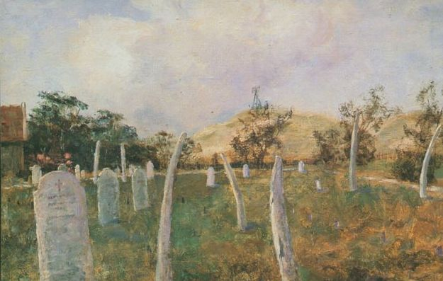 In 1919 liep Betzy Akersloot met verf, doek en penselen naar dit kerkhof om de merkwaardige grafpalen, gemaakt van walviskaken, te schilderen. Het is één van haar meest zonnige werken geworden in verdroomde tinten, die niets te maken hebben met de dood. Hoewel ze al ziek was, had de schilderes het reizen nog niet opgegeven; ze zwierf alleen van Florence naar Rome en van Sorento naar de Cote d'Azur. Haar motto 'Arbeide er livets glanspunkt' (werken geeft glans aan het leven) indachtig maakte ze nog een hele serie paneeltjes, niet groter dan ansichtkaarten. Totdat ze in december 1922 op 72-jarige leeftijd het penseel voor altijd neerlegde. Men begroef haar, volgens Betzy's laatste wens in een witte kist, op het Vlielandse kerkhof dat ze kort tevoren had geschilderd.