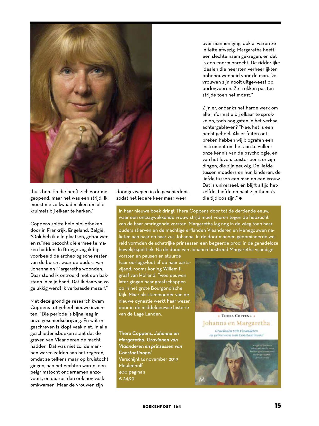 Het einde van het artikel wil ik u alvast laten lezen: 'De reikwijdte van Coppens' oeuvre beslaat inmiddels zo ongeveer het hele afgelopen millennium. Des te bewonderenswaardiger is het dan ook dat 'Johanna en Margaretha' zo'n rijkgeschakeerd beeld van de vroege dertiende eeuw geeft. Zo erudiet zijn, en dan bijzondere vrouwen van alle tijden in hun overweldigende geschiedenissen plaatsen, dat kan in Nederland alleen Thera Coppens.'