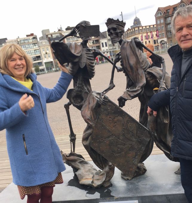 Sinds de verschijning van de dubbelbiografie heb ik overal lezingen gehouden. Totdat het coronavirus daar voorlopig een eind aan maakte. In de overvolle bibliotheekzaal van Sint-Niklaas - de stad die in de 13de eeuw van de gravinnen een stuk grond voor uitbreiding kreeg - gebeurde er iets bijzonders: daar stelde iemand zich voor als de beeldhouwer Frans Heirbaut, Hij bleek de maker van een bronzen beeld dat op de Markt staat en veel reacties van de voorbijgangers oproept. Johanna en Margaretha benadrukken daarin de sterfelijkheid van de mens, een geliefd thema in de hoge middeleeuwen, De zusters zijn uitgebeeld als elegante skeletten die zich amuseren met het maken van een hedendaagse selfie. Ze bekijken zichzelf in een spiegel, een bekend vanitas symbool dat hun ongeletterde tijdgenoten direct herkenden. De beeldhouwer kreeg in 2019 terecht de Cultuurprijs van Sint-Niklaas voor zijn schepping.