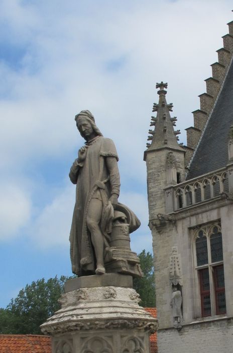 Het standbeeld van Van Maerlant voor het stadhuis in Damme
