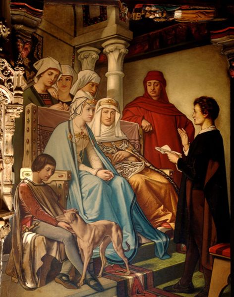 Diederik van Assenede leest Margaretha en haar schoondochter Beatrix voor uit zijn Floris en Blancefloer