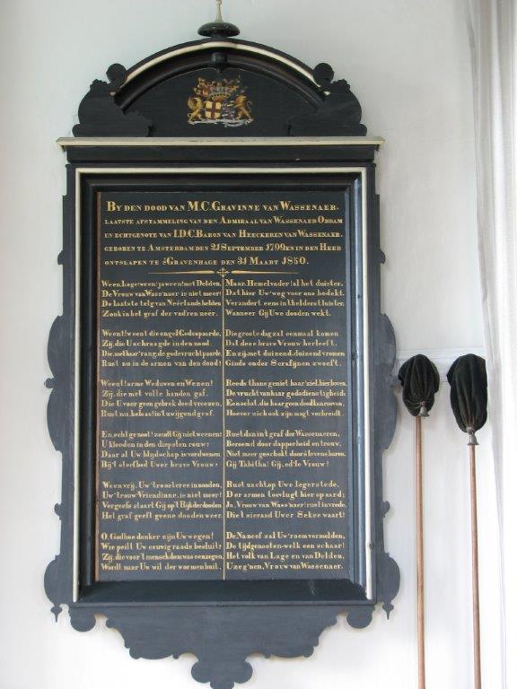 Dirk Lammersma van antiquariaat Interboek in het oosten van het land stuurde me deze foto van een rouwbord in een kerkje in Lage, net over de Duitse grens. Een 'Totentafel' vervaardigd BY DEN DOOD VAN M. C. GRAVINNEN VAN WASSENAER LAATSTE AFSTAMMELING VAN DEN ADMIRAAL VAN WASSENAER OBDAM EN ECHTGENOTE VAN J. D. C. BARON VAN HEECKEREN VAN WASSENAER.