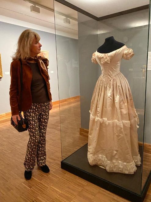 Toen ik mijn Nederlandse boek 'Sophie in Weimar' schreef, ontmoette ik de achter-achterkleindochter van Prinses Sophie Cornelie Brena die me waardevolle informatie gaf. Ik kreeg van haar ook een geweldig geschenk: een hofjapon uit het bezit van Prinses Sophie. De tand des tijds zet zich graag in textiel en dat was ook aan de 19e eeuwse japon te zien. Tijdens het schrijven lag Sophies japon – vol van haar dna, zo besefte ik - uitgespreid op de bank en was elke dag een bron van inspiratie voor me.