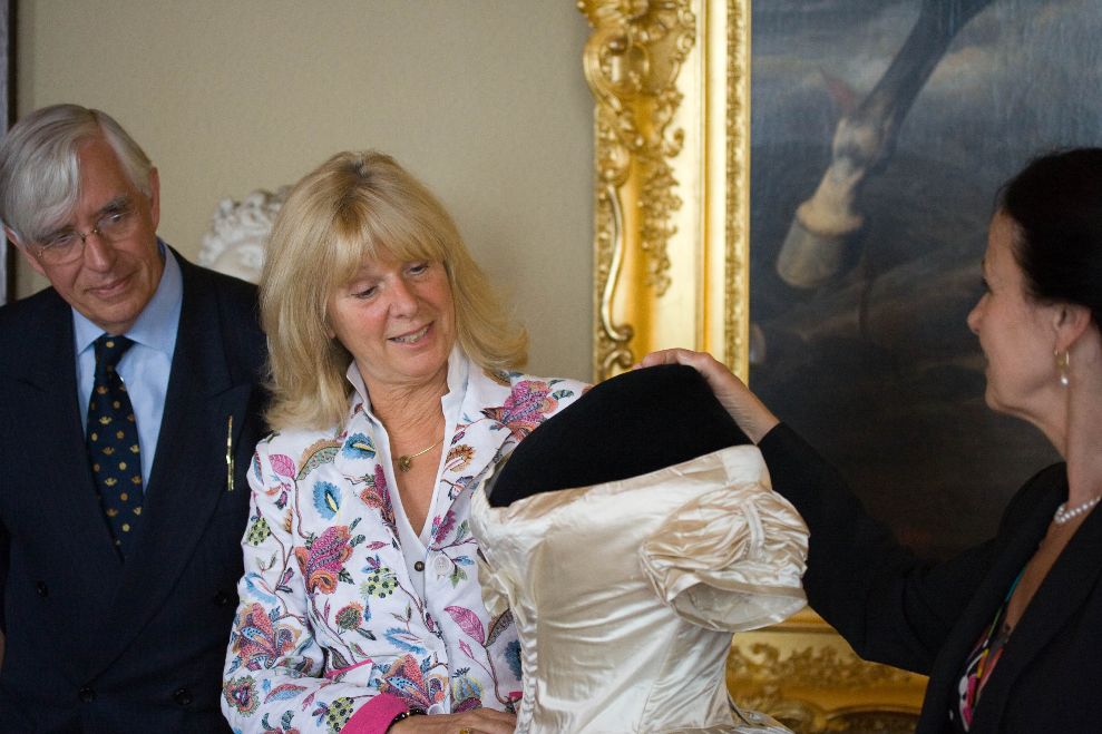 Cornelie en Thera bij de overdracht van de hofjapon aan Paleis Het Loo in 2011