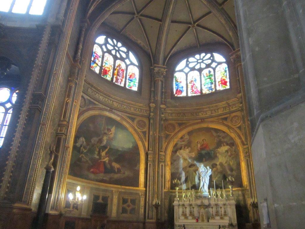Coutoure maakte in 1856 de wandschilderingen in de kapel van de Saint Eustache. Daarop worden de macht en de voorspraak van de Heilige Maagd Maria geheel naar de smaak van zijn tijd gesymboliseerd. Couture werd alom geprezen en voor zijn prestatie en vorstelijk betaald. Maar zijn geniale leerling Manet moest zijn mond houden en eerst eens leren schilderen Couture zei dat hij nooit een groot kunstenaar zou worden. Pas vele jaren na de dood van Manet werd zijn talent wereldwijd erkend. En Couture is vrijwel vergeten. In 1866 dirigeerde Franz Liszt in deze prachtige oude kerk (nabij les Halles) zijn eigen composities. Waren Suzanne Leenhoff en haar man Edouard Manet hierbij aanwezig? Of misschien in 1886 toen de Grande Messe werd uitgevoerd in tegenwoordigheid van Liszt? Het is een van de vele onbeantwoorde vragen waar je in de Saint Eustache voor de Heilige Maagd van Couture lang kunt mijmeren.