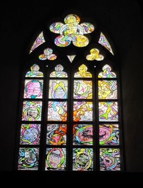 Het machtige bouwwerk leeft met zijn tijd mee en dat blijkt al in de vestibule waar boven het entree een prachtig glas-in-lood-venster is te zien van Het Laatste Oordeel door Marc Mulders. Het raam volgt de traditionele driedeling: boven de hemel, onder de hel en daar tussenin het vagevuur. Mulders heeft het gewaagd om moderne tinten roze, lila en oranje te gebruiken, die opvlammen in de gotische omlijsting van het spitsboogvenster. In de hel herinnert een vliegtuig links onder aan de gruwelijke aanslag van nine eleven op Twin Towers. In het hoge visblaasmotief troont God in stralend gouden tinten op de regenboog.