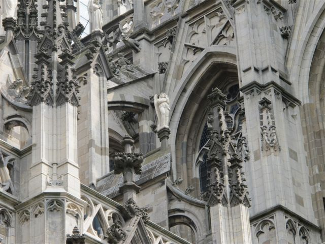 Wie door de kathedraal dwaalt ziet het prachtige Antwerpse Lijdensaltaar uit ca 1500 in de Sint Antoniuskapel, de middeleeuwse muurschilderingen, de glas-in-lood-ramen, de rode gewelfribben en de vergulde sluitstenen. Maar hoe hoger het oog reikt des te meer heb je behoefte aan een verrekijker, die ook tijdens een wandeling om de kathedraal heen onontbeerlijk is. Een duizelingwekkend aantal gebeeldhouwde Bijbelse figuren, dieren, monsters en waterspuwers bevolkt het exterieur.